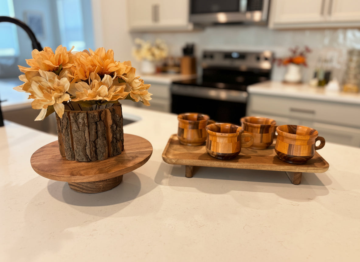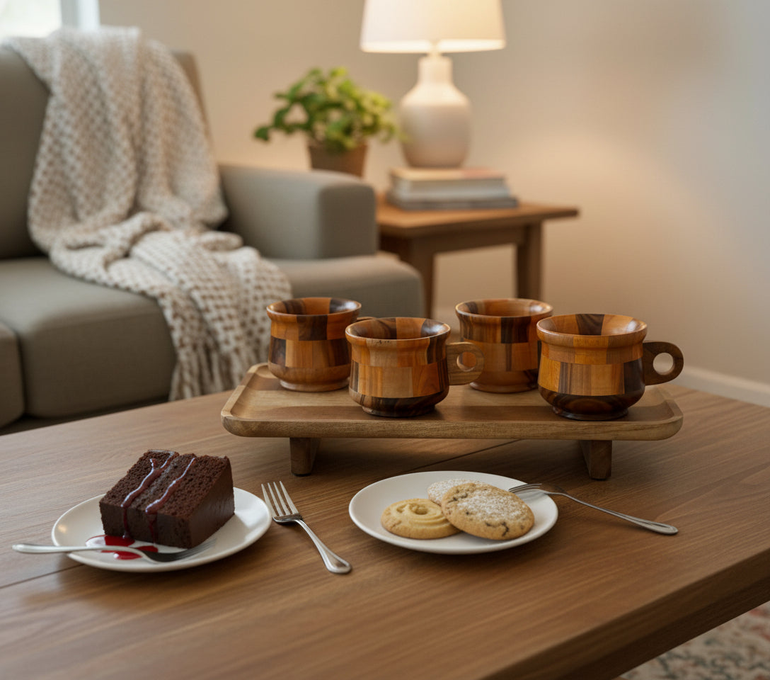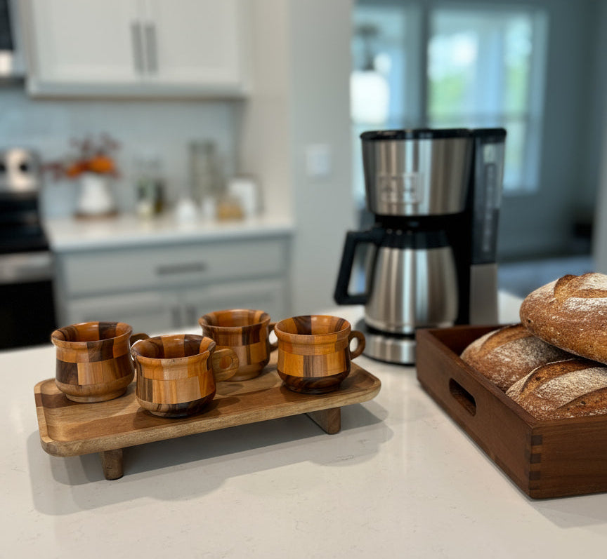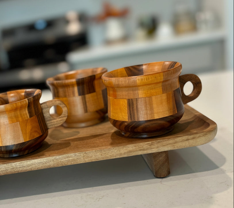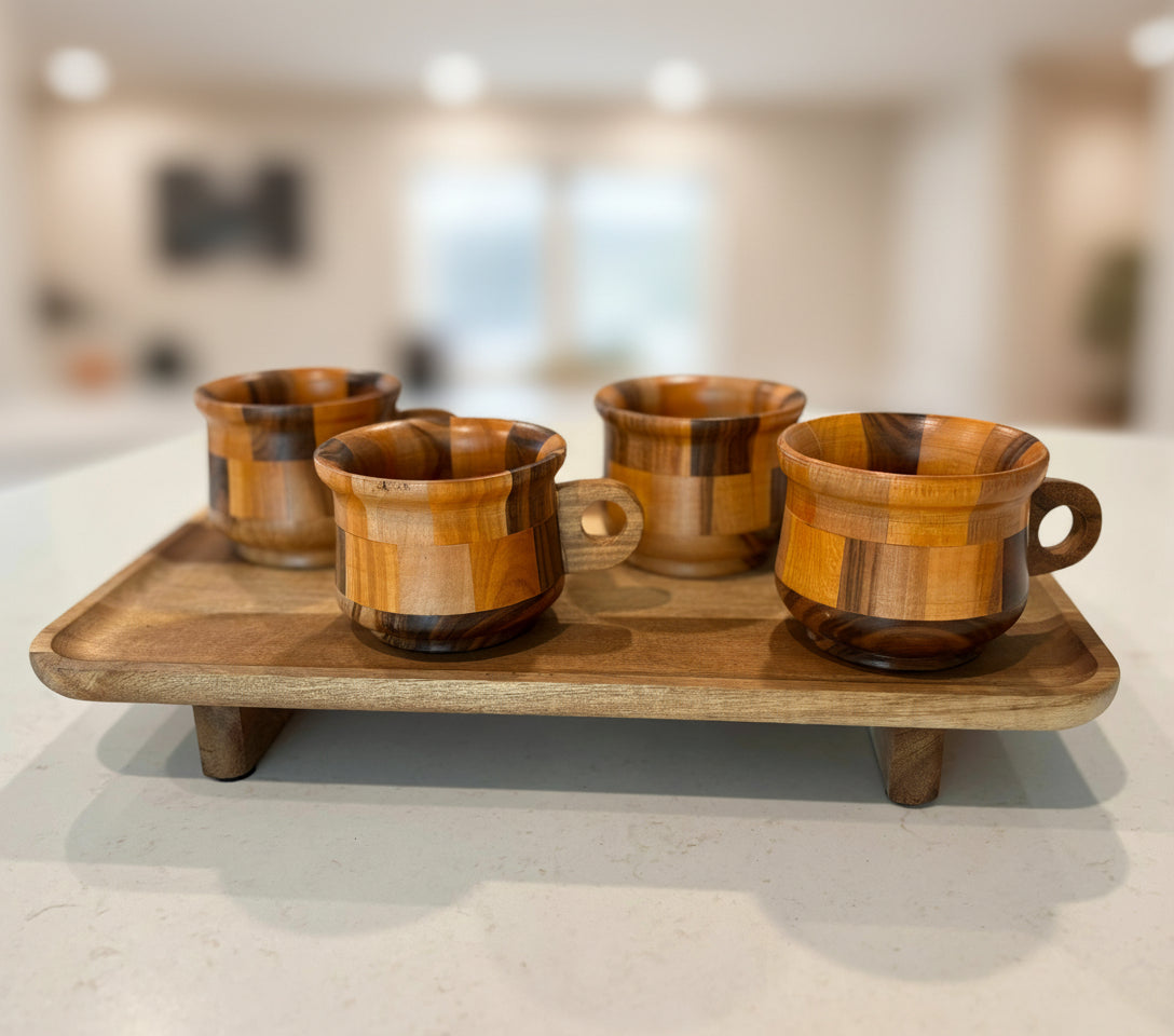 Meet our Art at Home Mug Set: four handcrafted teak mugs resting on a Acacia wooden tray. Perfect for serving, gifting, or simply enjoying your morning ritual.