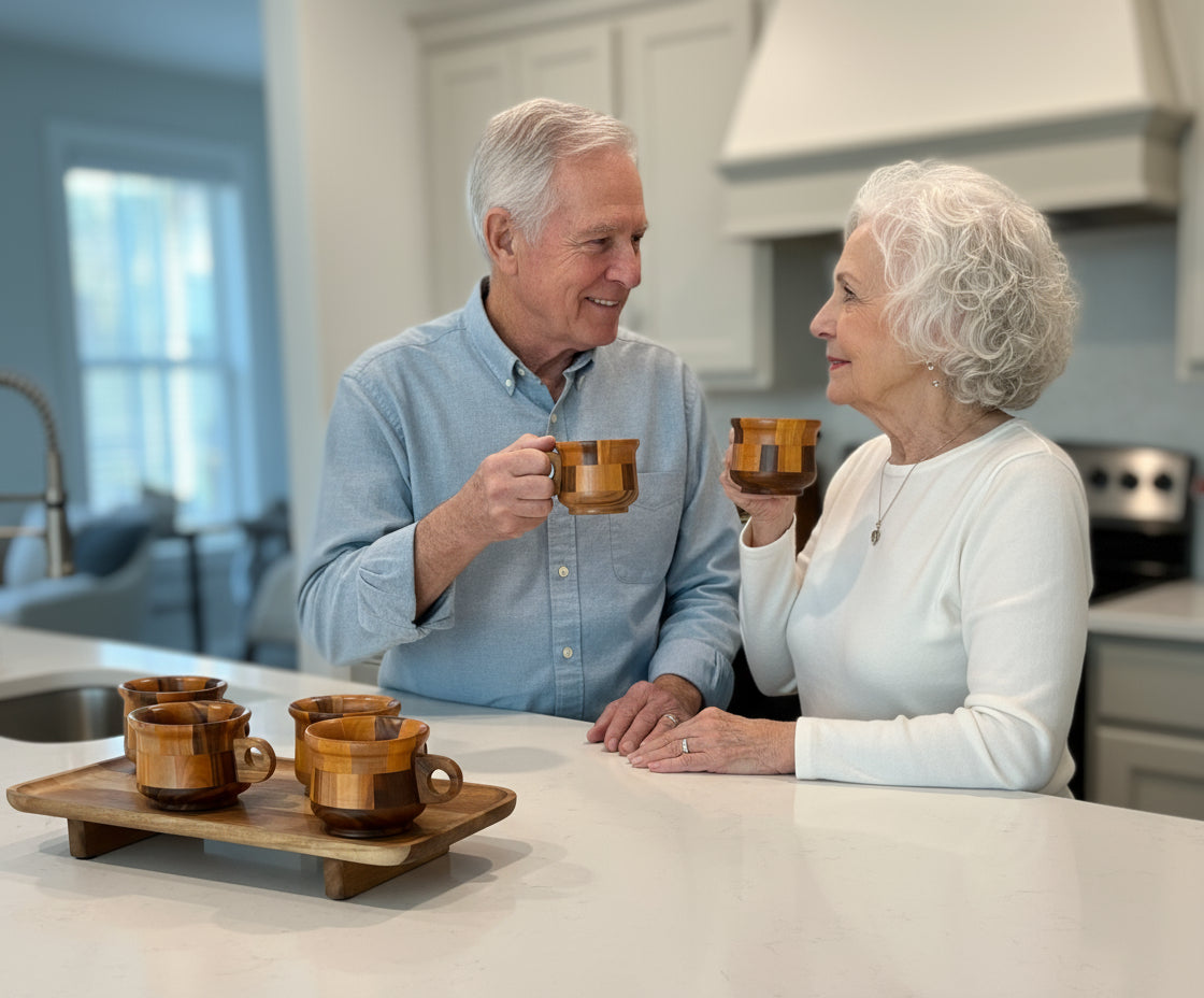 Our Art at Home Teak Mug Set brings the beauty of natural wood to every table.