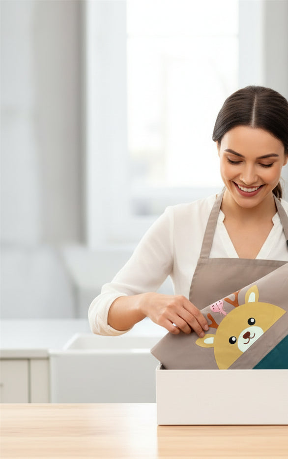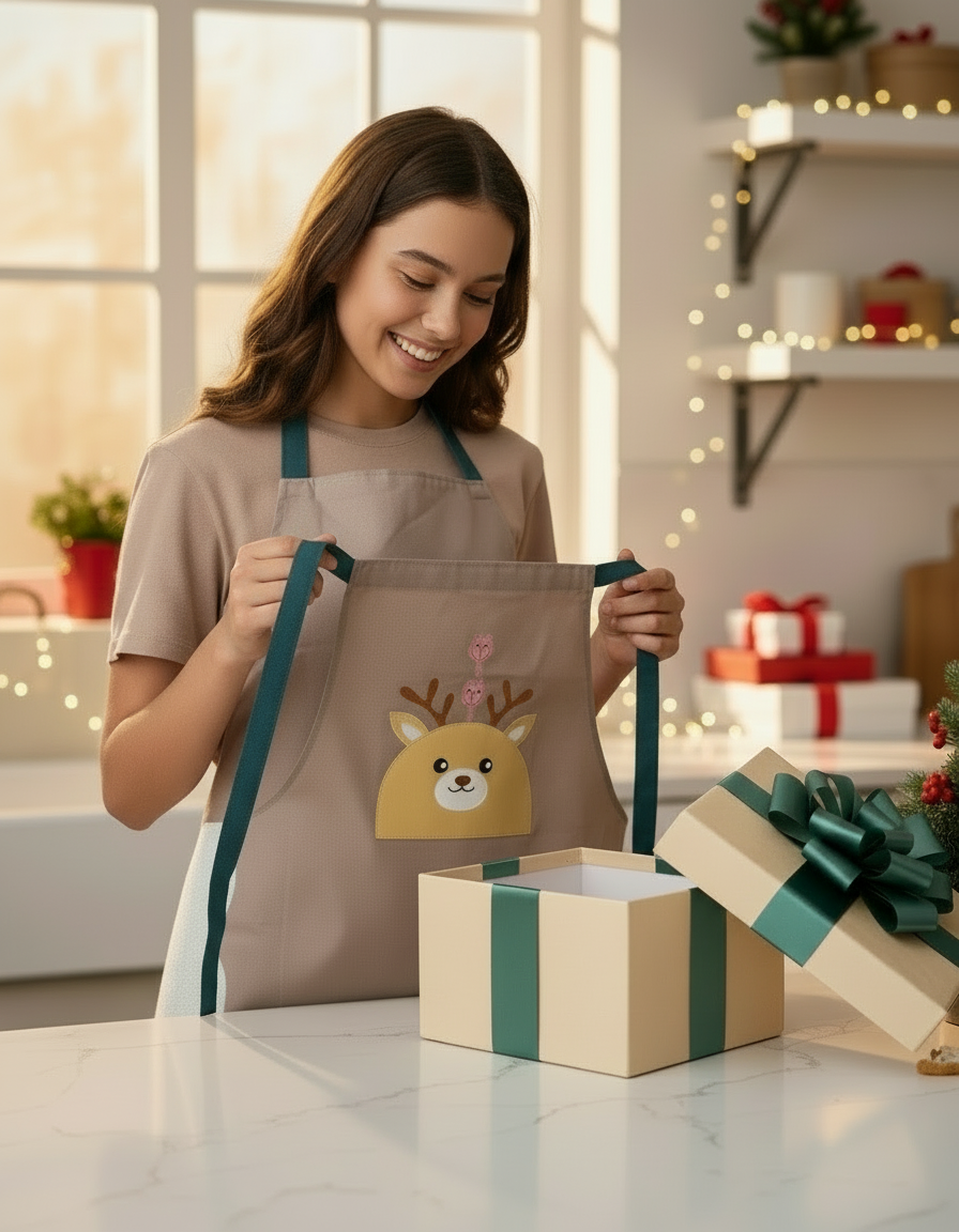 The apron features a super cute pink reindeer design, a large central pocket, and a practical side towel panel for drying your hands. Made with water-resistant fabric, it keeps you clean, protected, and comfortable while you cook or bake.