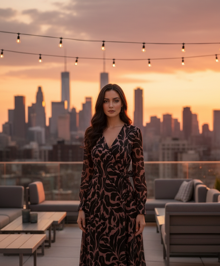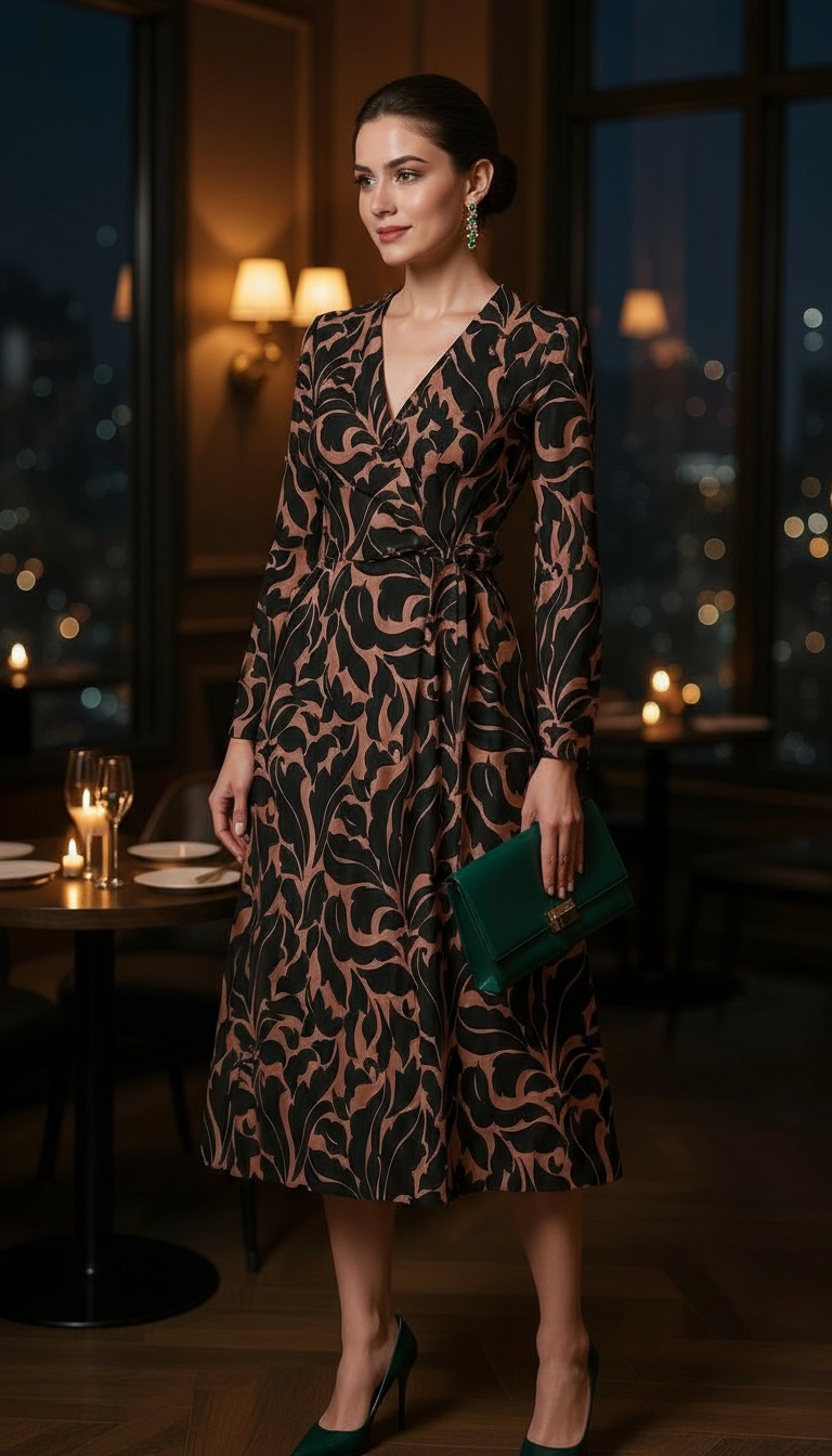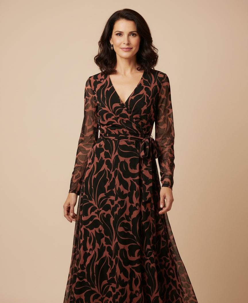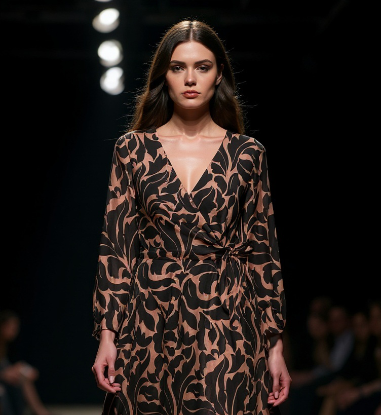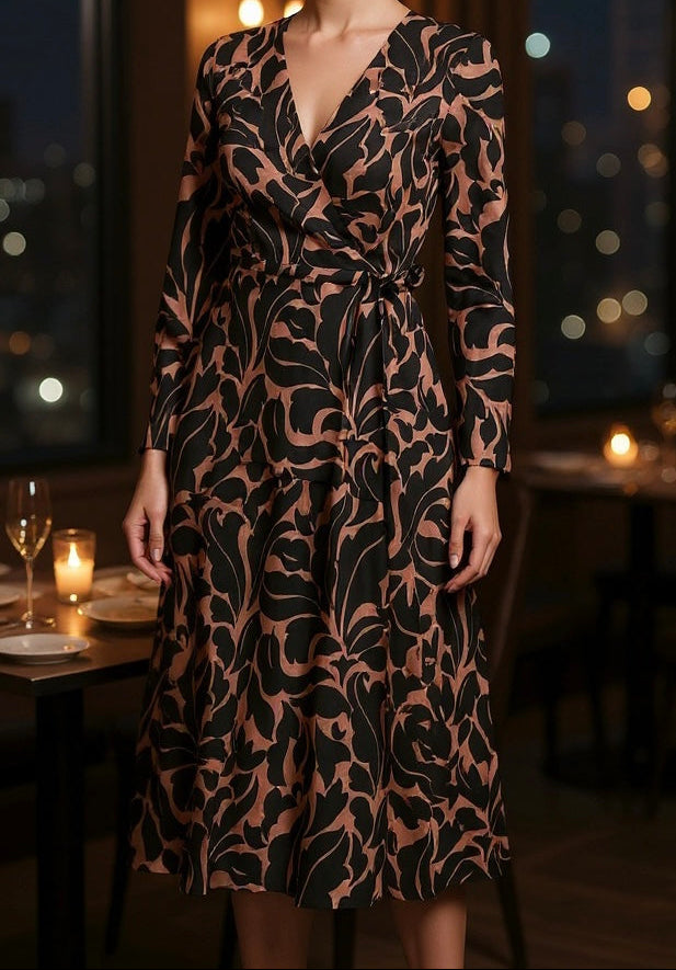 A bold, sophisticated dress designed to flatter your silhouette and turn heads. Perfect for end-of-year events, celebrations, and elegant nights out. The V Romantic Dress is more than a garment — it’s a statement. Created in rich, strong tones and a striking irregular leaf print, this dress blends modern style with an unmistakably elegant touch.