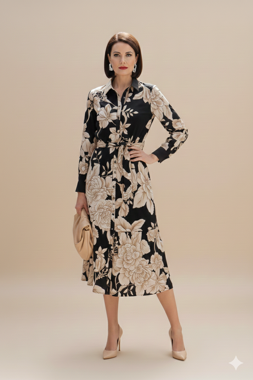The striking contrast between delicate beige florals and a deep black ground creates visual interest. At the same time, a row of gleaming gold buttons traces the front placket. Long sleeves and a structured shirt collar lend polish, while the cinched waist—defined by an adjustable belt—flatters the silhouette.